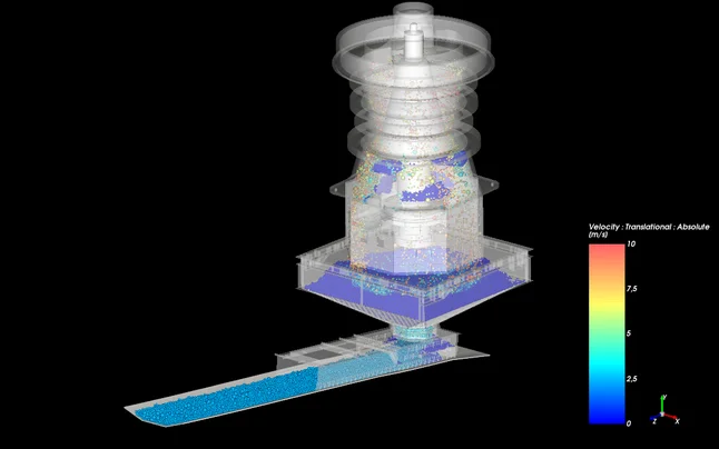 The Discrete Element Method (DEM) has become increasingly important in recent years. It can simulate the interactions between individual particles of bulk materials. This allows not only for the simulation and visualization of material flow, but also for the analysis of the forces and moments acting on different parts of contact surfaces. Material tests are required to adjust simulation parameters and verify results. TAKRAF experts use DEM tools to optimize equipment design.