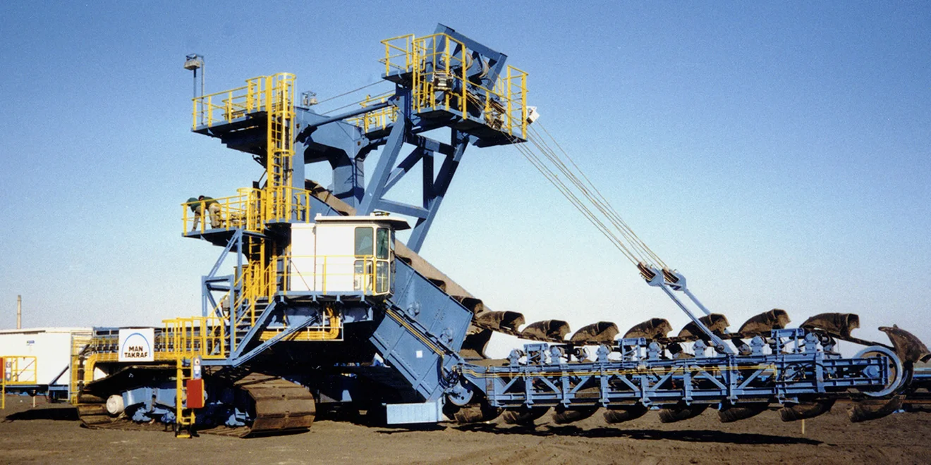 The bucket-chain excavator ERs 500 is a crawler-mounted machine with low ground pressure for operation in an ash deposit of a thermal power plant. Further features are: