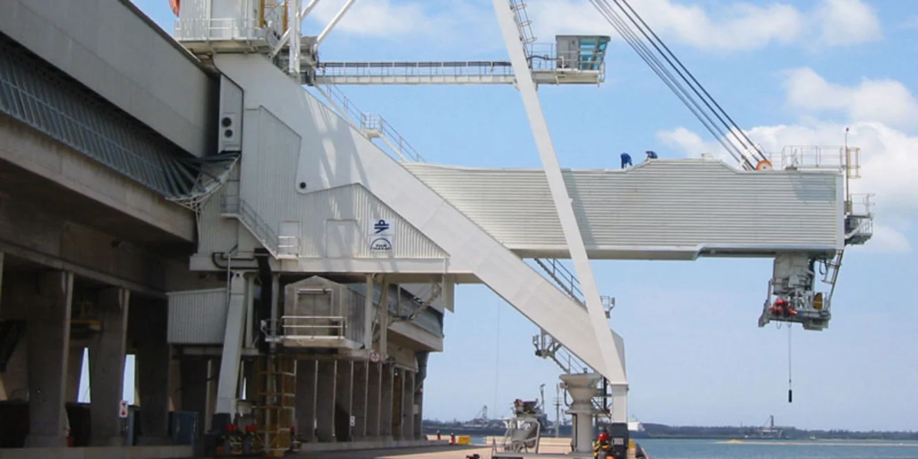 This ship loader is luffable via winch and equipped with a shuttle. It is possible to use 3 interchangeable discharge chutes for different materials. The stockyard conveyor system is completely covered with automatic opening when the ship loader moves on the quay.