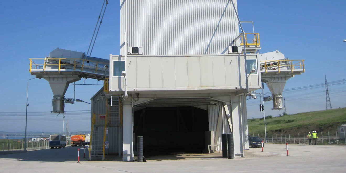 This truck loading station has two loading chutes and one shuttle conveyor to distribute the conveyed material. The loading chutes are telescope type.