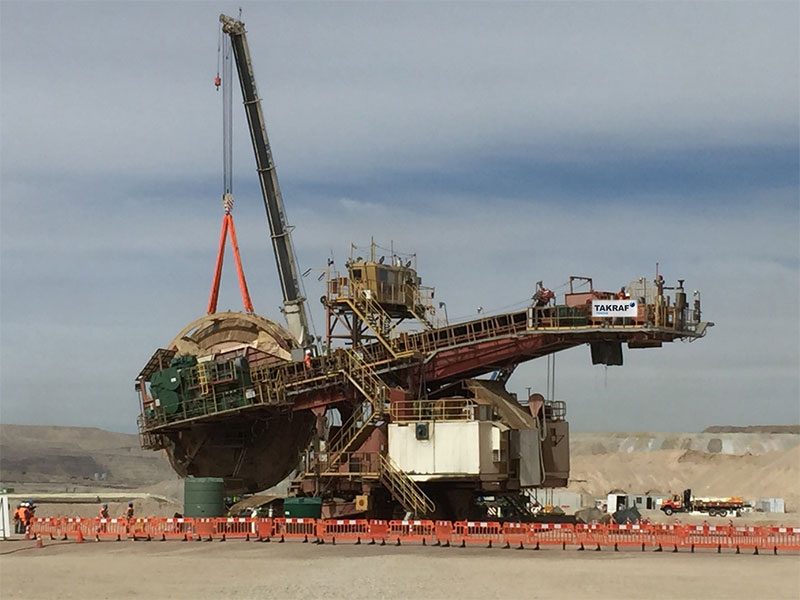 As a result, the original TAKRAF Bucket-Wheel Reclaimer (BWR), model HR 5000, currently on site needed to be replaced in order to increase the handling capacity. The decision was made to replace this machine with another TAKRAF machine, model HR 7100, which, up until recently, operated at another of the company’s mine sites about 170 km away. This machine, with a design capacity of 11,500 tph, is to be disassembled and transported by an external service provider with support and technical assistance from TAKRAF Chile.
