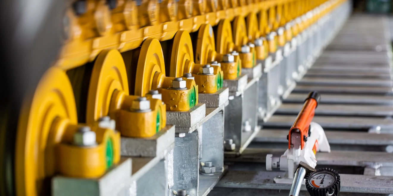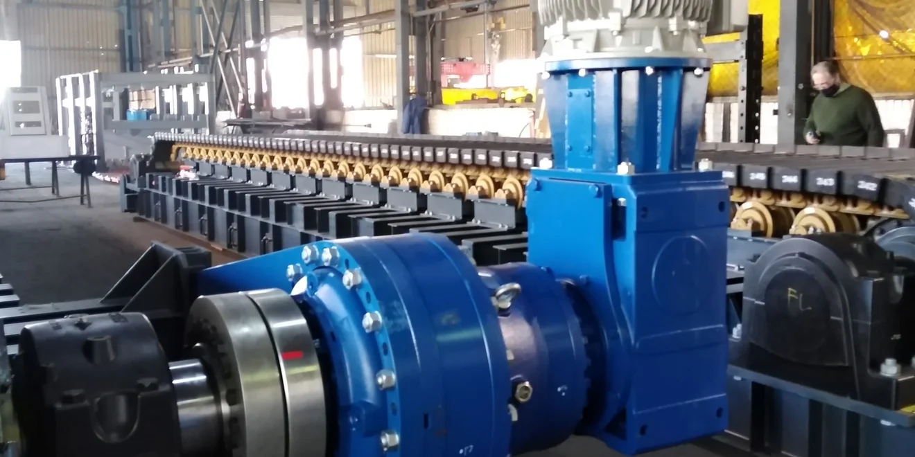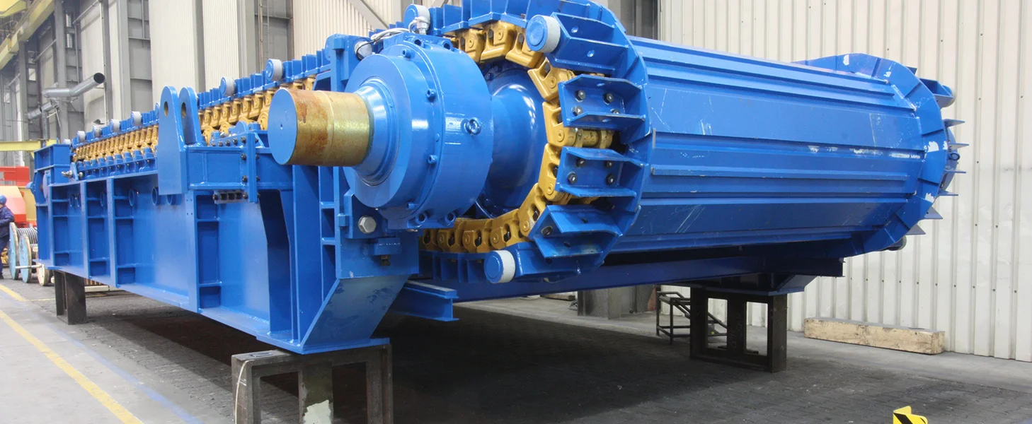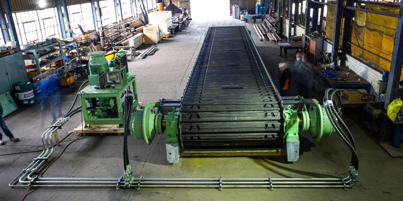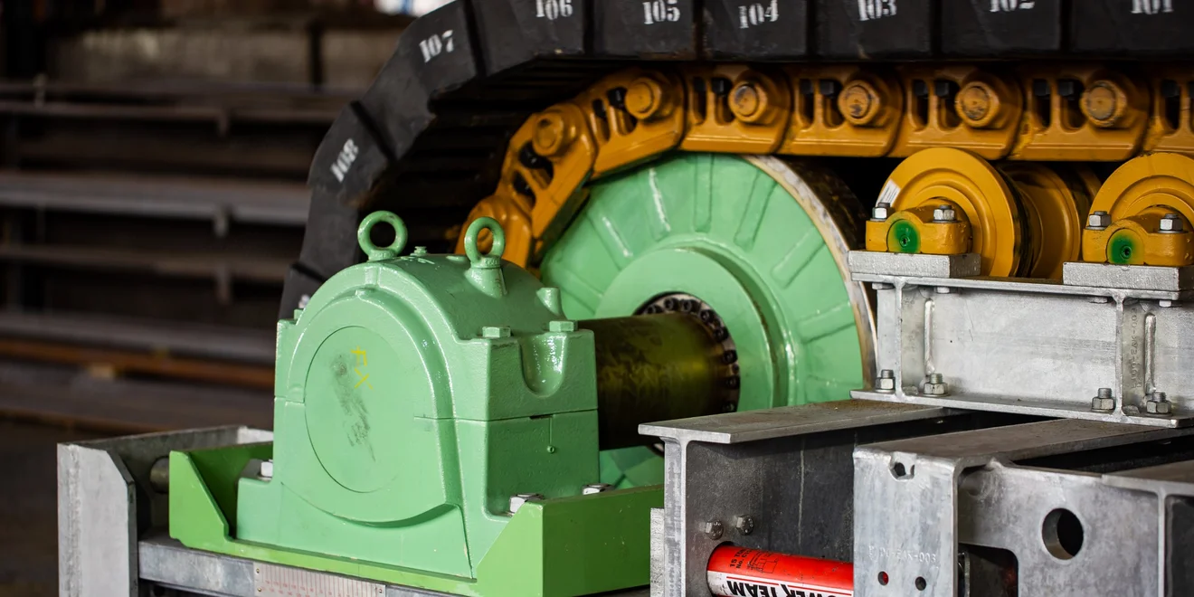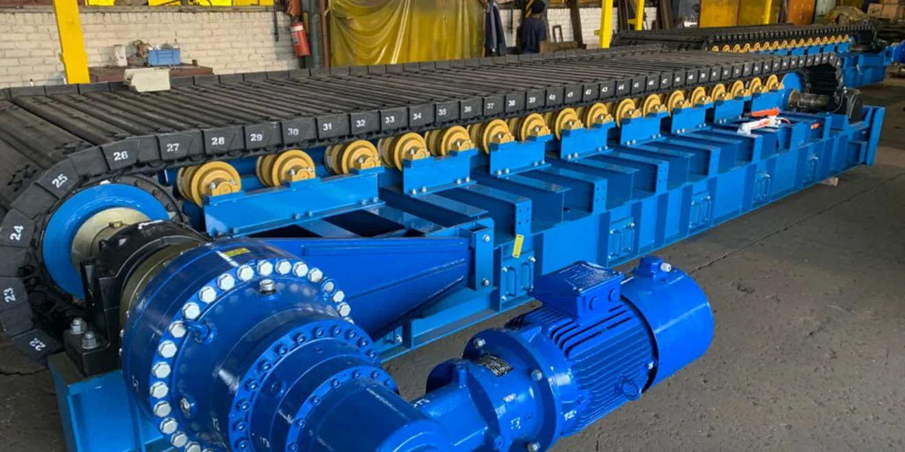 The tail shaft is manufactured from forged alloy steel and is equipped with steel traction wheels, keyed to the shaft or attached by clamping elements. The head shaft and tail shaft rotate in anti-friction, self-aligning spherical roller bearings. Chain take-up is accomplished by means of manually operated single acting hydraulic cylinders acting on the tail shaft bearing housings.