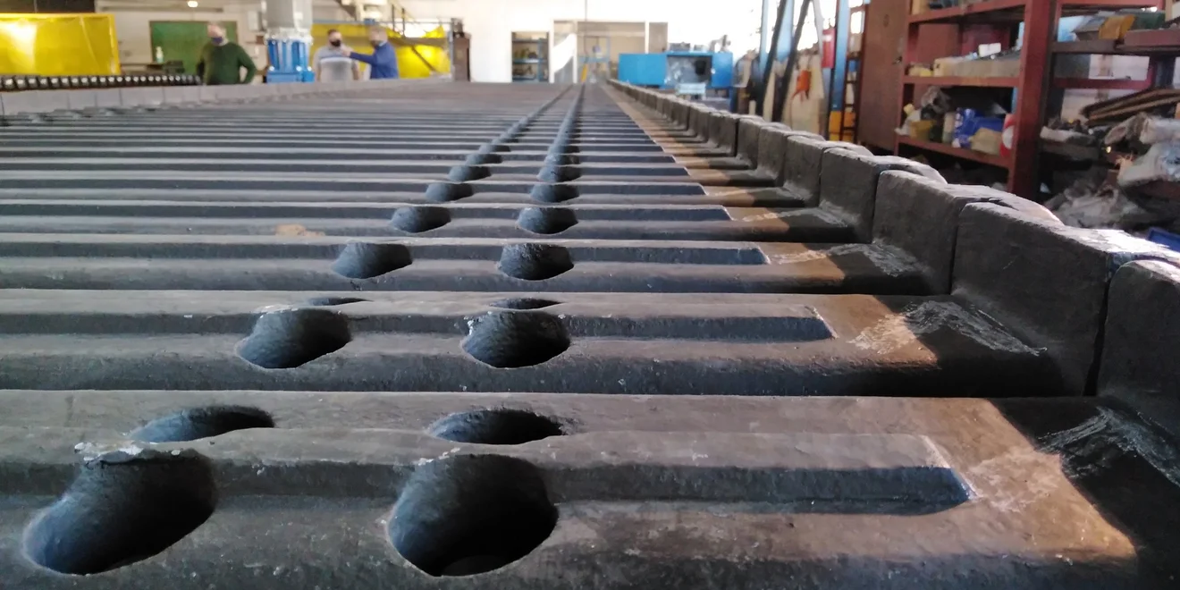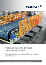 The TAKRAF Apron Feeder has a heavy-duty main frame, which can be designed to be either self-contained or integrated into a plant and hopper structure. It is equipped with either welded or cast design flights or pans. The pans/flights are heavily reinforced underneath to withstand all bending loads. The flights are bolted to two strands of tractor chains. The attachment can either be in-board (inside chain) or outboard (outside chain). Attachment is by track bolts and square track nuts.