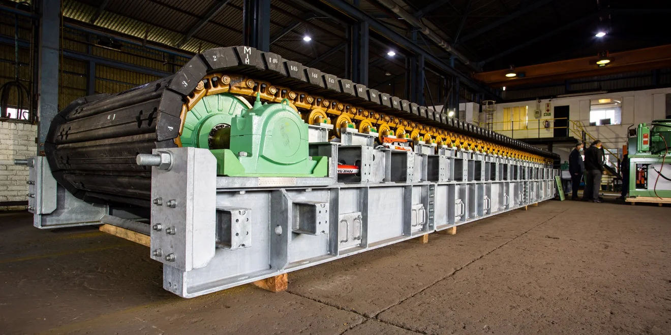 The chain is forged and induction hardened (SALT or dry chain type) and may be joined by a split or pin master link. Adjacent flights overlap to minimize spillage. The load rollers and return rollers will be standard crawler type sealed and lubricated rollers, manufactured from hardened forged steel and incorporating bronze bearings. All rollers are flanged to provide lateral guidance to the chain and flights. Corrosion protection of fabricated items is to the standard TAKRAF system.
