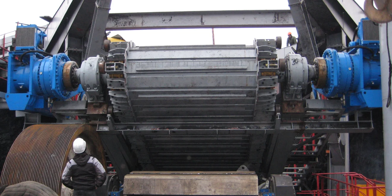 The drive shaft supports up to two variable speed drives, which are designed either as hydraulic or electro-mechanical drives. These drives are connected with a flange coupling or shrink disk connection. The drives are provided with an integrated torque arm that is attached to a bolted adapter on the apron feeder main frame.