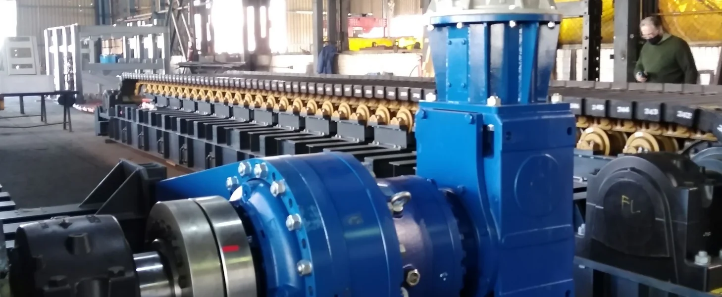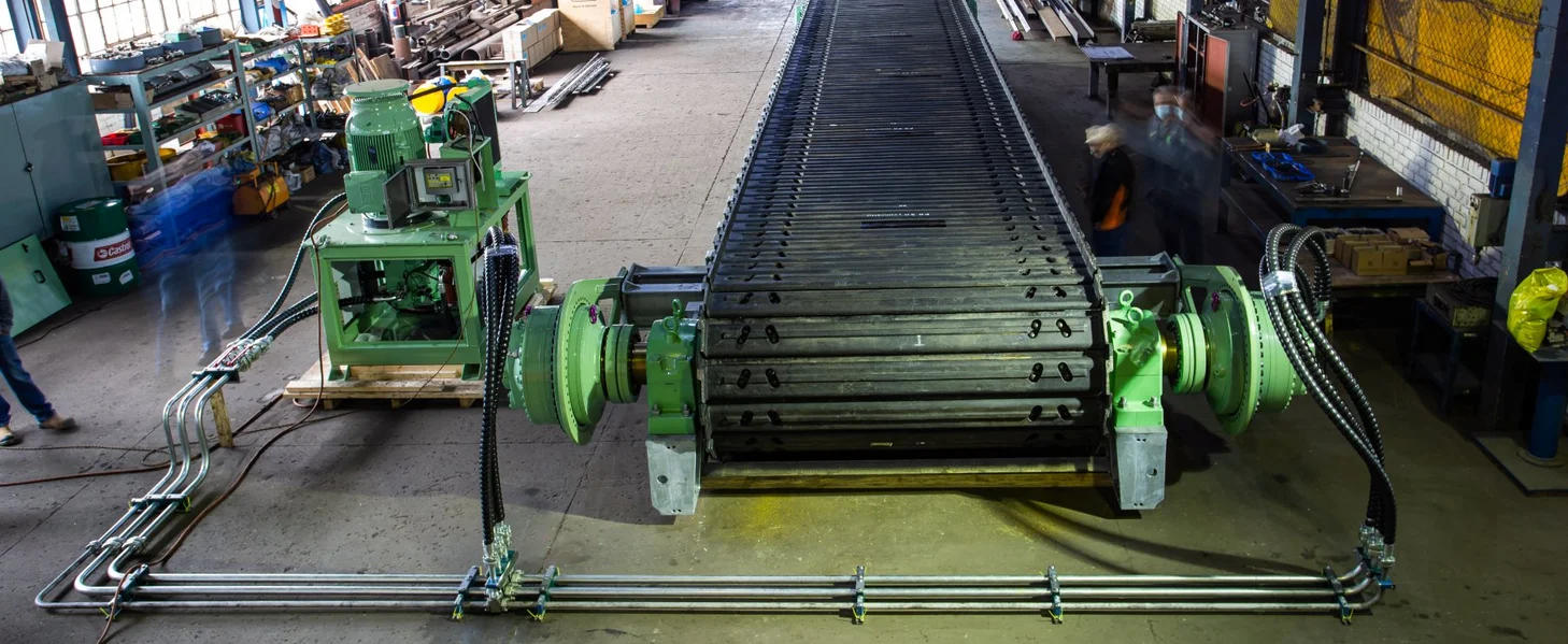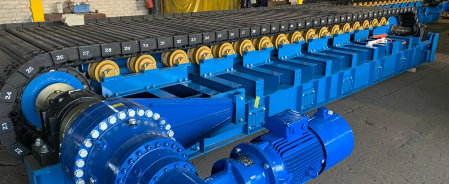 The tail shaft is manufactured from forged alloy steel and is equipped with steel traction wheels, keyed to the shaft or attached by clamping elements. The head shaft and tail shaft rotate in anti-friction, self-aligning spherical roller bearings. Chain take-up is accomplished by means of manually operated single acting hydraulic cylinders acting on the tail shaft bearing housings.