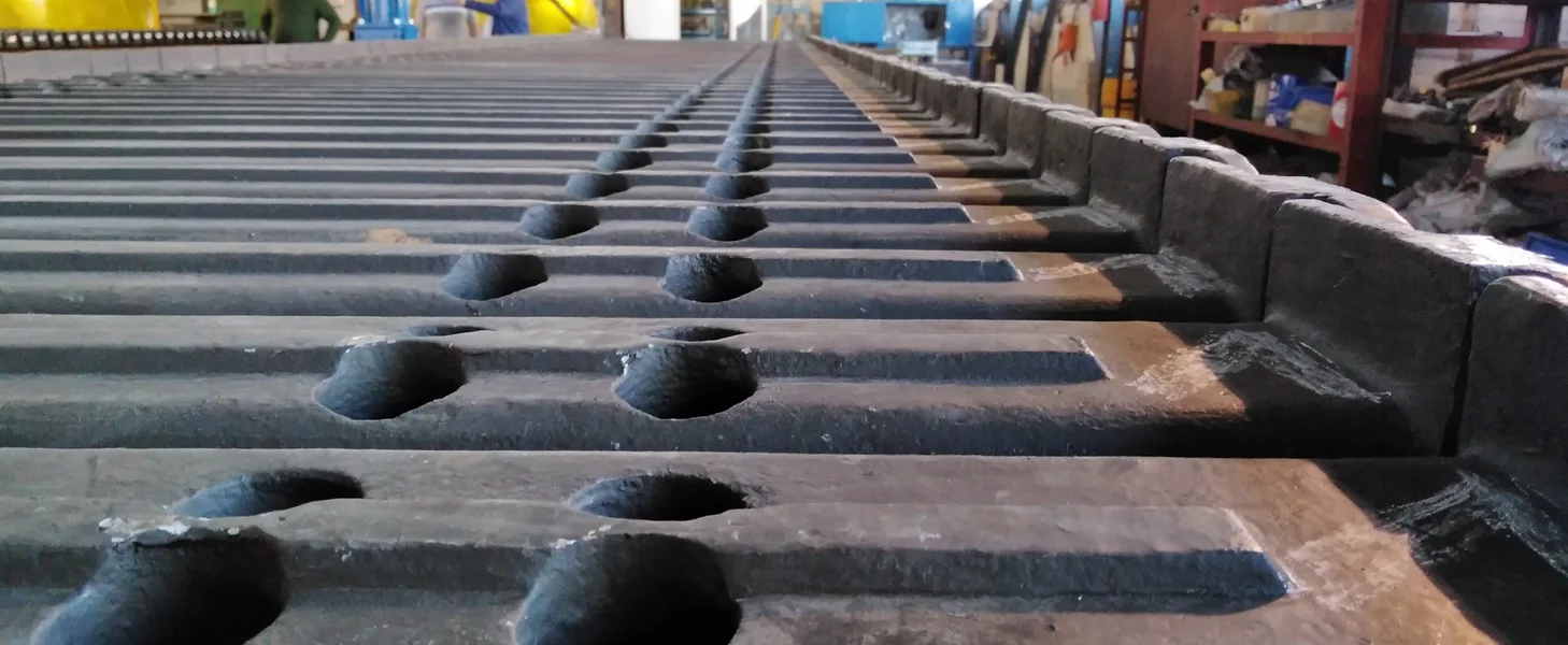 The TAKRAF Apron Feeder has a heavy-duty main frame, which can be designed to be either self-contained or integrated into a plant and hopper structure. It is equipped with either welded or cast design flights or pans. The pans/flights are heavily reinforced underneath to withstand all bending loads. The flights are bolted to two strands of tractor chains. The attachment can either be in-board (inside chain) or outboard (outside chain). Attachment is by track bolts and square track nuts.