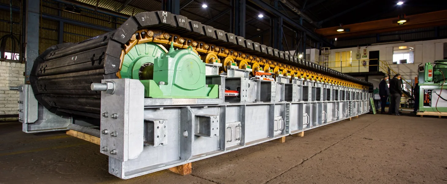 The chain is forged and induction hardened (SALT or dry chain type) and may be joined by a split or pin master link. Adjacent flights overlap to minimize spillage. The load rollers and return rollers will be standard crawler type sealed and lubricated rollers, manufactured from hardened forged steel and incorporating bronze bearings. All rollers are flanged to provide lateral guidance to the chain and flights. Corrosion protection of fabricated items is to the standard TAKRAF system.