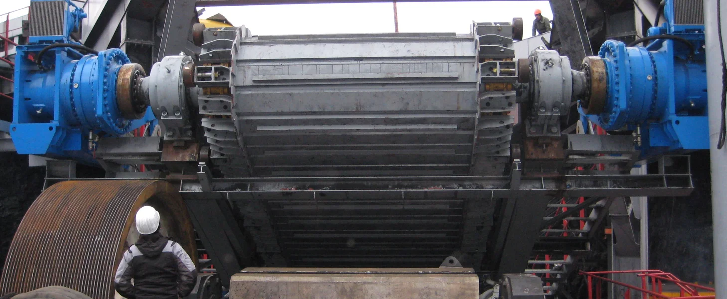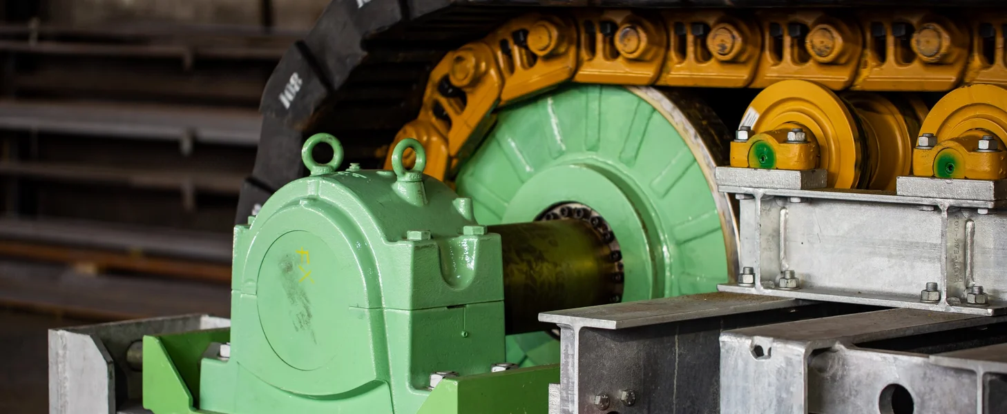 The drive shaft supports up to two variable speed drives, which are designed either as hydraulic or electro-mechanical drives. These drives are connected with a flange coupling or shrink disk connection. The drives are provided with an integrated torque arm that is attached to a bolted adapter on the apron feeder main frame.
